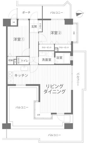 東面の広々としたバルコニーは、セカンドリビングとしても使え、3面バルコニーが特徴のお部屋です。