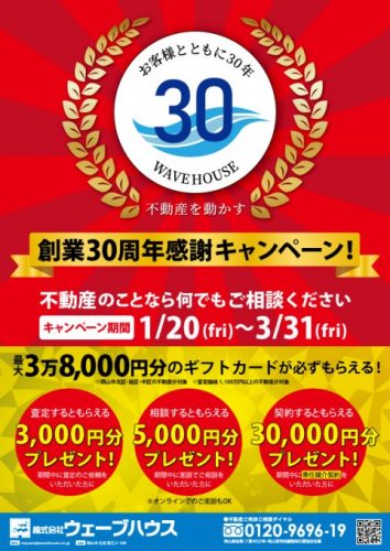 ウェーブハウスの畝尾です。 弊社の加盟している不動産ネットワーク「イエステーション」のセールスコンテストが3月よりスタートしております! セールスコンテストとは、全国の加盟している不動産会社ごと、営業同士が、より多くのお … Continue reading 創業30周年キャンペーンも同時開催のセルコン!
